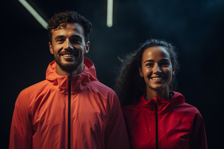 couple of happy fitness man and woman in sportswear with perfect slim bodies standing in gym club. personal trainer healthy lifestyle