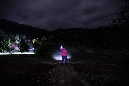 Man watching a meteorite with a flashlight in the night sky.
