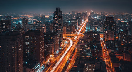 Captivating night cityscape showcasing illuminated highways and skyscrapers. The vibrant light trails create dynamic energy and movement.
