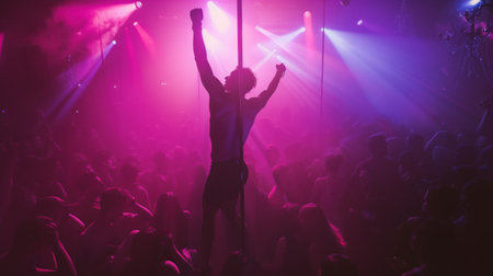 Silhouetted man celebrating energetically on a dance pole in a vibrant nightclub