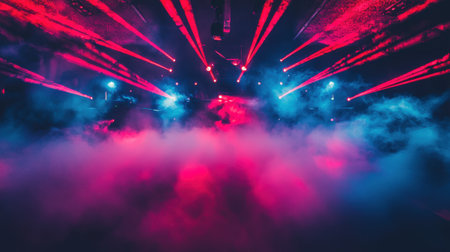 A cinematic club scene with intense red and blue laser beams piercing through deep stage fog.