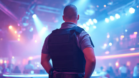 A security personnel stands watch in a vibrant nightclub, highlighting the energetic atmosphere filled with colorful lights, ensuring safety and enjoyment for all guests.