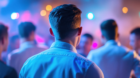 Rear view of a man standing in a crowded nightclub with neon lights. Concept of nightlife, socializing, and entertainment