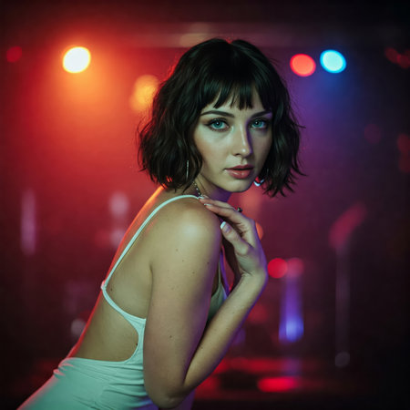Portrait of beautiful young woman dancing at night club with colorful lights