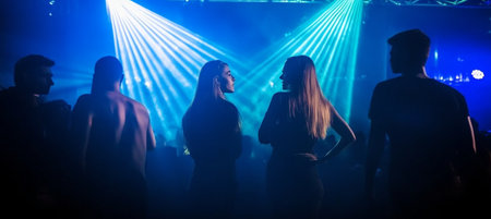 Silhouettes of girls on New Year's holiday in blue neon light, blurred background