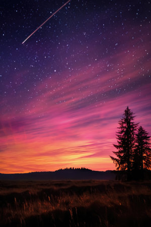 A stunning view of a vibrant sunset sky features a shooting star streaking across the twilight horizon. This captivating mountain landscape showcases the beauty of nature as stars twinkle above, creating a peaceful and serene atmosphere perfect for inspiring adventure and relaxation.