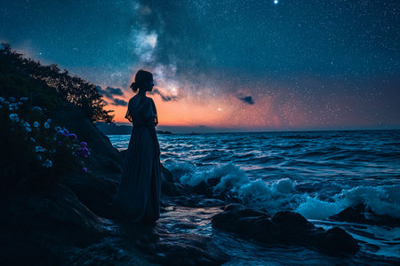 starry night sky woman standing rocks looking ocean girl lady glowing flowers dress glow coming gaze downcast reach interconnected stunningly, generative ai