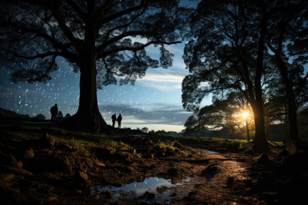 Tranquil scene of dark forest reflects starry Milky Way galaxy generated by artificial intelligence