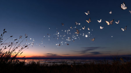 Experience the enchanting scene of a sunset where butterflies gracefully dance over calm waters. This enchanting artwork captures tranquility and beauty in nature.
