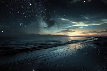AI Generated. Milky Way reflects on tranquil beach sunset