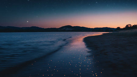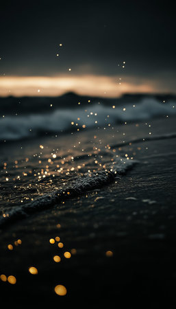 Serene Twilight Seascape with Gentle Waves, Dark Beach, and Calm Reflective Water Surface