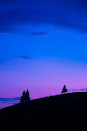 View of moon in blue hour after sunset with pine tree silhouette with copy space