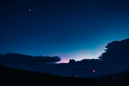 Colorful sunset on the mountain. Colorful sky with stars.