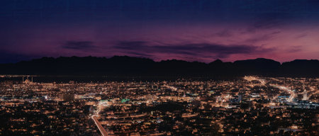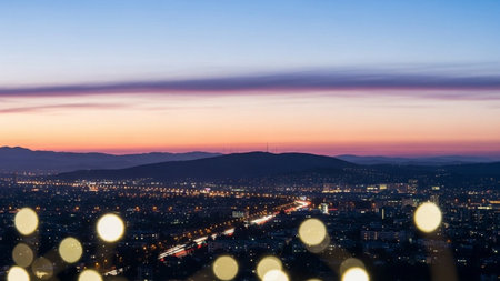 A panoramic view of a city at dusk, showcasing a stunning skyline with illuminated buildings and a colorful sky transitioning from day to night.