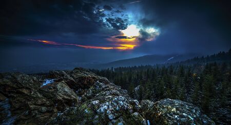 landscape mountains forests sky in the evening sunset