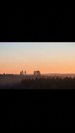 A misty forest silhouette against a soft orange and yellow gradient sunset sky, with a few tall trees standing out.