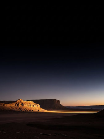 A dramatic desert landscape at dusk illuminated sandstone rock formations bathed in warm light, contrasting with the deep blue and dark sky, creating a sense of vastness and solitude.