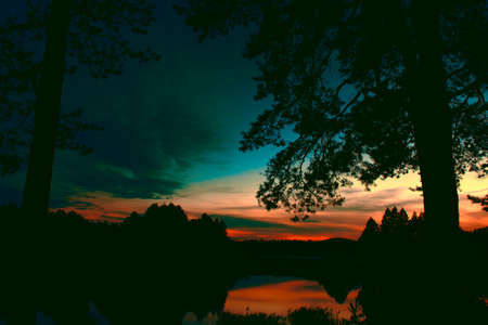 a fabulous journey in the forest in search of adventure, a bright sunset and a forest lake with a reflecting sky in the water.surrealism.