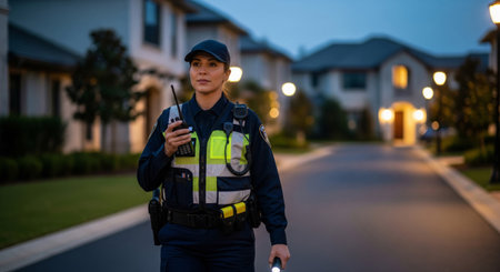 Professional female security guard with radio and reflective vest patrolling residential street at dusk..