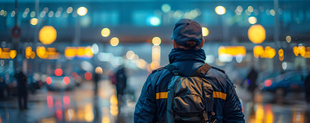 Security guard facing away keeping watch in airports. Concept Airport Security, Surveillance, Vigilant Guard, Occupational Safety, Public Protection