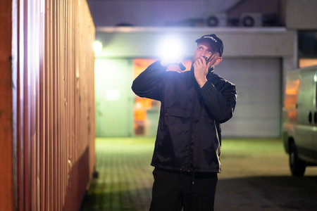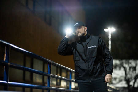 Security Guard Officer Using Walkie-Talkie Radio At Night
