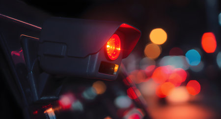 Illuminated security camera monitoring traffic with blurred city lights at nighttime setting