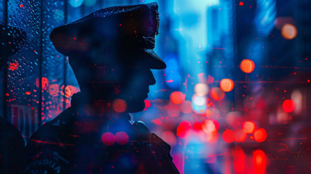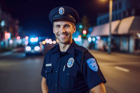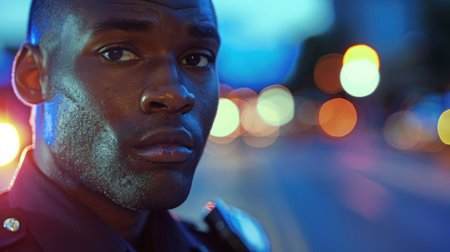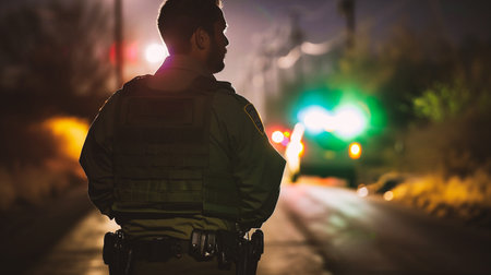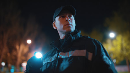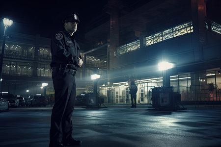 Police officer stands vigilant at night, illuminated by streetlights, showcasing sense of duty and alertness. scene captures essence of law enforcement in calm yet watchful environment