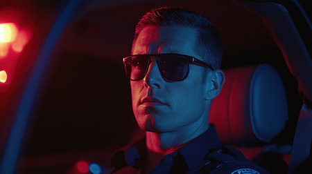A serious police officer sits inside a patrol vehicle at night, wearing sunglasses with red and blue lights reflecting around him.