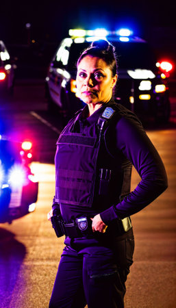 A female police officer stands confidently during nighttime patrol, with the vibrant lights of a police car in the background.