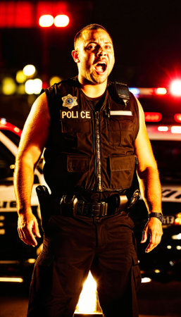 photo of police officer law enforcement standing working on scene with angry feeling at night, generative AI