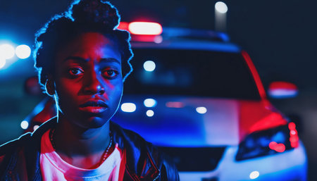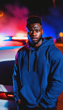 photo of portrait close up view of criminal suspect in crime scene standing in front of police car at night and red blue light, generative AI