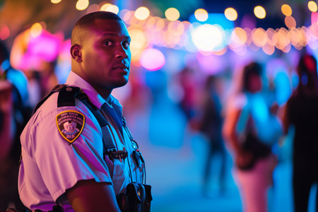 Two serious security guards stand watch in an urban setting at night, embodying vigilance and protection against a backdrop of blurred bokeh lights.