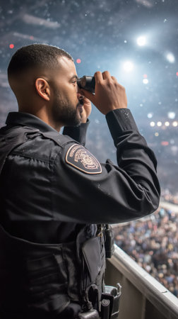 Security professional monitoring crowd with binoculars during event in large stadium, ensuring safety and surveillance