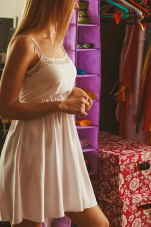 Fashion and female wardrobe. Young pretty girl in changing room. Woman looking for clothes outfit in cloakroom.