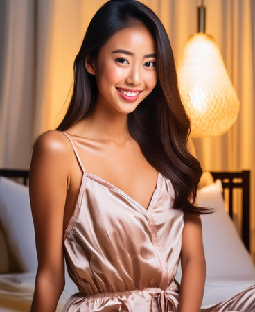 Beautiful Asian woman smiling brightly while posing on a messy bed in a dimly lit room, wearing champagne-colored satin sleepwear accented with white lace.