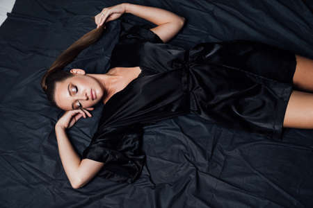 portrait of a beautiful woman in black linen on a bed in the bedroom