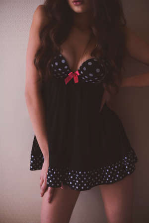 Woman in underwear dotted shirt with red bows showing her neckline