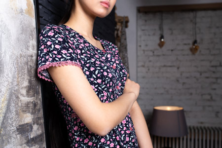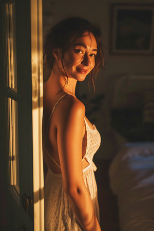 Beautiful young woman in bedroom, she is wearing a nice summer dress.