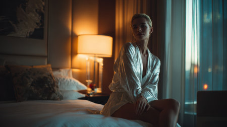 Sensual blonde model relaxing on bed in luxurious hotel room