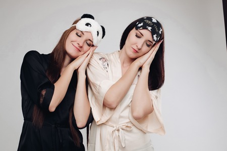 Lifestyle, friendship and people concept - two beautiful girls dressed in pajamas hugging and smiling