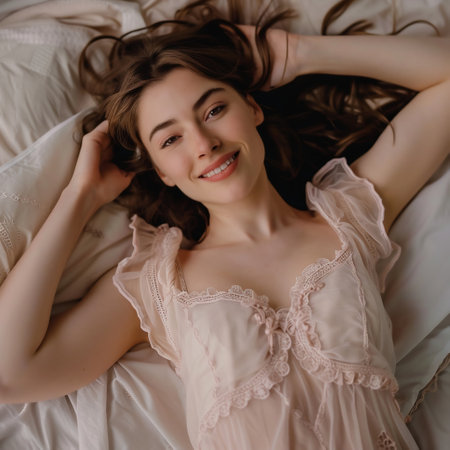 Brunette woman smiling contentedly while sitting on soft white bedding, wearing a sheer golden floral lace pajama set illuminated by warm ambient bedroom light.