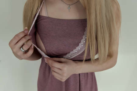 Sexy and romantic shopping. Gorgeous sensual long haired woman buying seductive clothes lingerie. Dylema of choosing underwear.