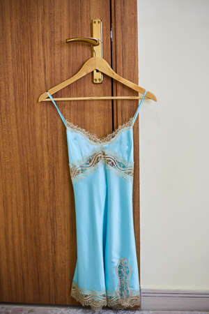 a woman's nightgown hangs on the door.