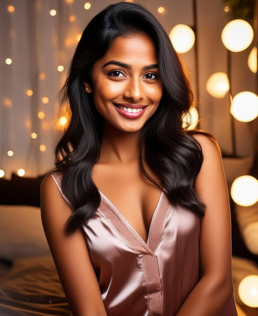 Serene Black female model sitting cross-legged in a bedroom setting, featuring warm ambient light, peach satin sleepwear, and a glowing white pillar candle.