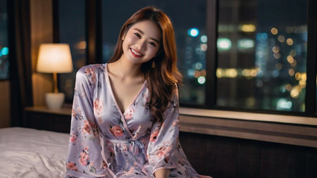 Beautiful asian woman in pajamas is sitting on the bed and smiling.