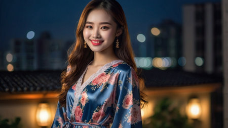 Beautiful asian woman wearing kimono in the city at night