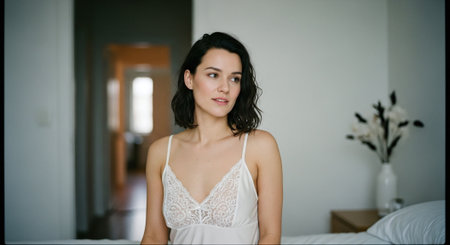 Portrait of a beautiful young woman in white lingerie in the bedroom