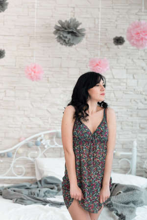 Wistfully looking brunette woman in sarafan. Young beautiful woman in bedroom reflectively standing near bed. Serious woman rumpling her dress