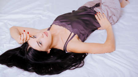 Beautiful brunette woman in a black silk negligee lying on the bed