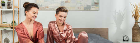 positive pansexual people in robe and satin pajamas smiling in bedroom, banner